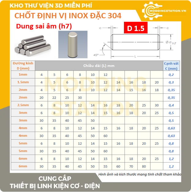 - Các kích thước: D1.5x4mm, D1.5x5mm, D1.5x6mm, D1.5x8mm, D1.5x10mm, D1.5x12mm, D1.5x14mm, D1.5x16mm, D1.5x18mm, D1.5x20mm