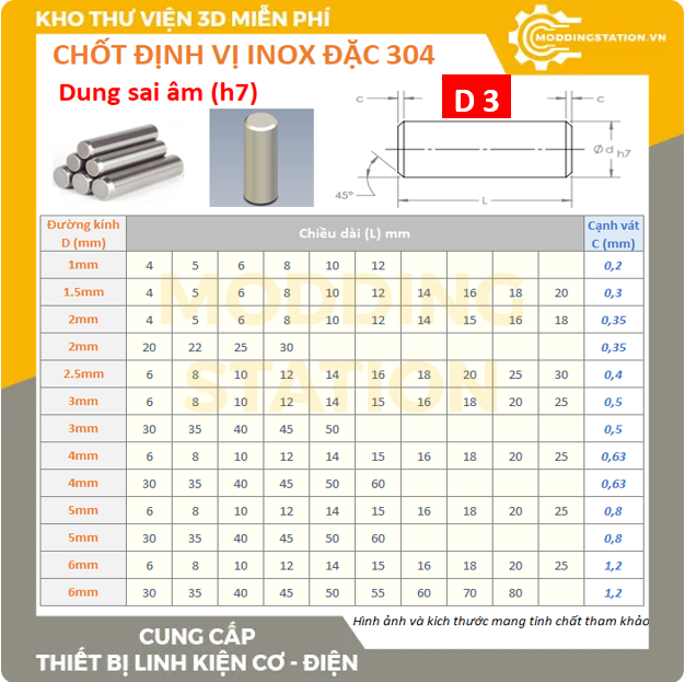 - Các kích thước: D3x6mm, D3x8mm, D3x10mm, D3x12mm, D3x14mm, D3x15mm, D3x16mm, D3x18mm, D3x20mm, D3x22mm, D3x25mm, D3x30mm, D3x35mm, D3x40mm, D3x45mm, D3x50mm