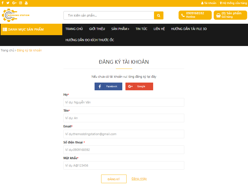 - Truy cập vào đường link: https://moddingstation.vn/account/register hoặc click và nút "Tài khoản" ở đầu trang và chọn nút "Đăng ký"