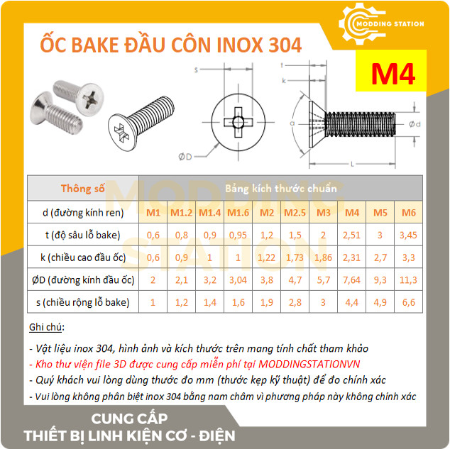 BAKECONM4x12 Ốc Bake đầu côn inox 304 size M4x12 (Chỉ còn 20 sản phẩm) 1.100₫