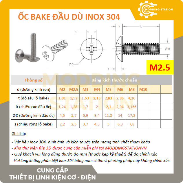 - Ốc Bake đầu dù inox 304 size M2.5x8mm (tên Tiếng Anh: Cross Countersunk Head Screw)