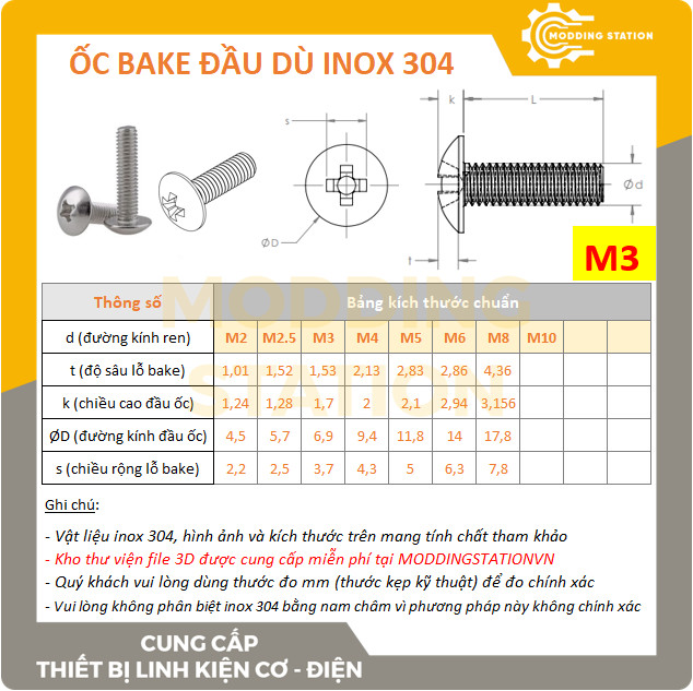 - Ốc Bake đầu dù inox 304 size M3x8mm (tên Tiếng Anh: Cross Button Head Screw)