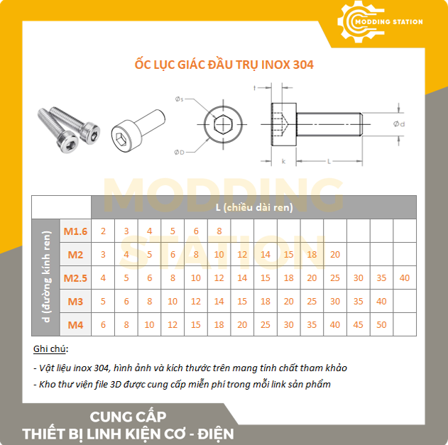- Các kích thước: M3x5mm, M3x6mm, M3x8mm, M3x10mm, M3x12mm, M3x14mm, M3x15mm, M3x18mm, M3x20mm, M3x25mm, M3x30mm, M3x35mm, M3x40mm